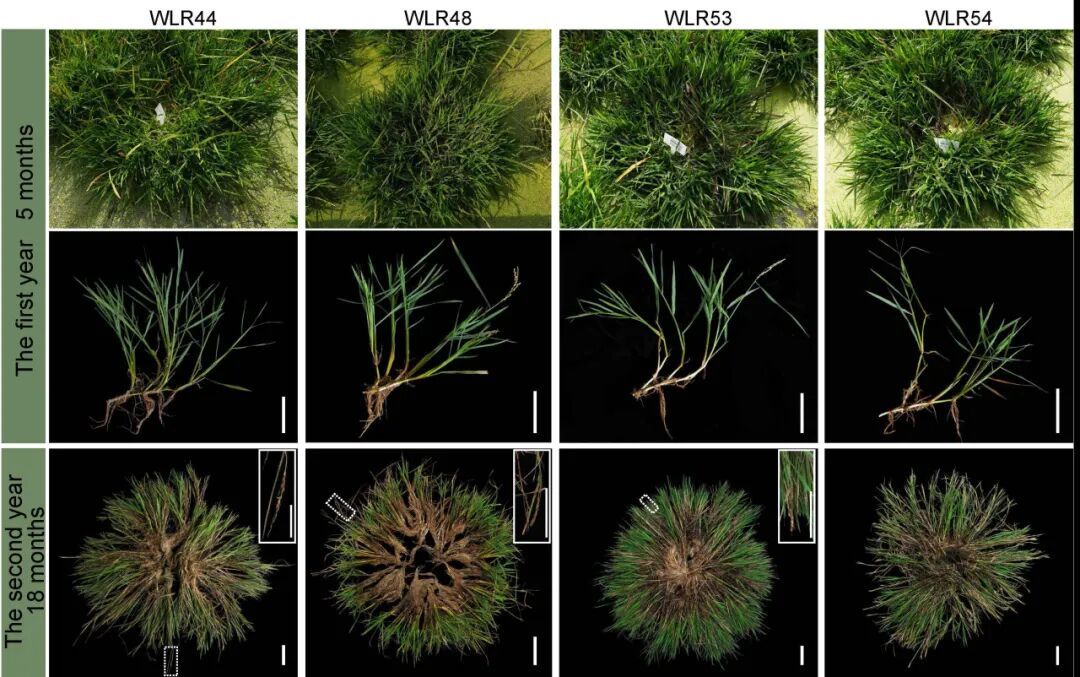 前两行为不同株系在生长约5个月时的表型,分别呈现了整体植株和分枝的形态。第三行为在海南种植、生长达18个月的“类野生稻”的状态。