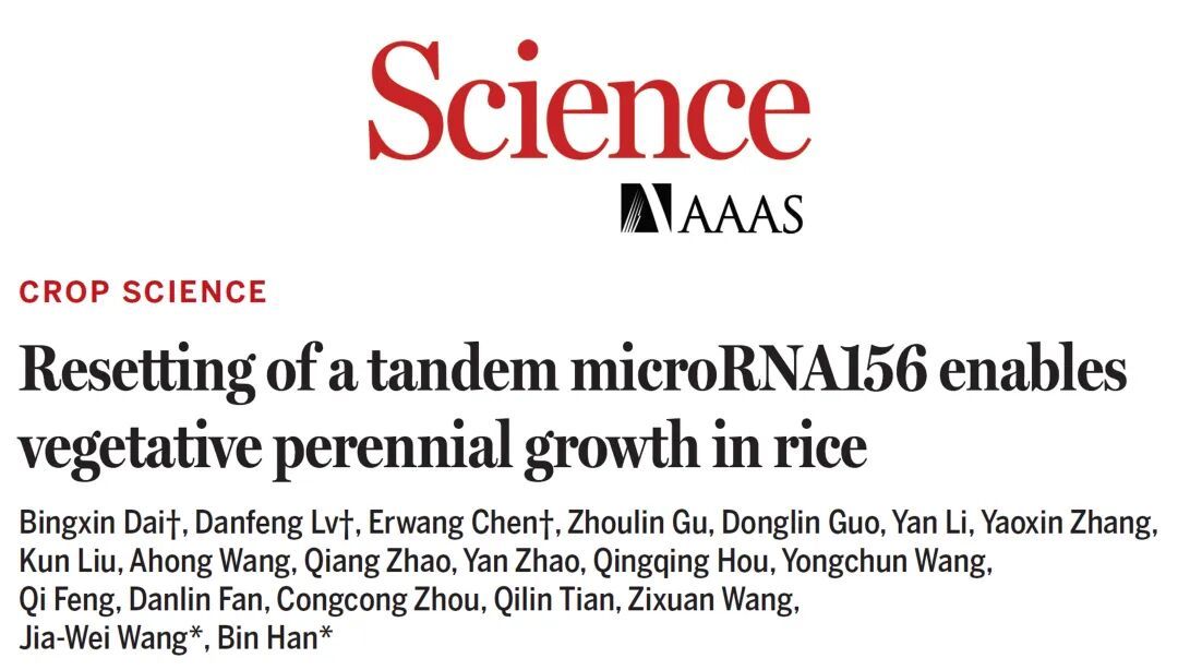 中国科学院分子植物科学卓越创新中心微信公众号消息,北京时间2026年3月20日,中国科学院分子植物科学卓越创新中心,植物性状形成与塑造全国重点实验室韩斌院士团队和植物高效碳汇重点实验室(中国科学院)王佳伟研究员团队,以封面形式在国际权威学术期刊《科学》(Science)上发表题为“Resetting of a tandem microRNA156 enables vegetative perennial growth in rice”的论文。该研究首次克隆了决定野生稻多年生生活习性的关键基因EBT1,并阐明了该基因座位表达模式的改变是水稻在驯化过程中由多年生向一年生转变的关键。