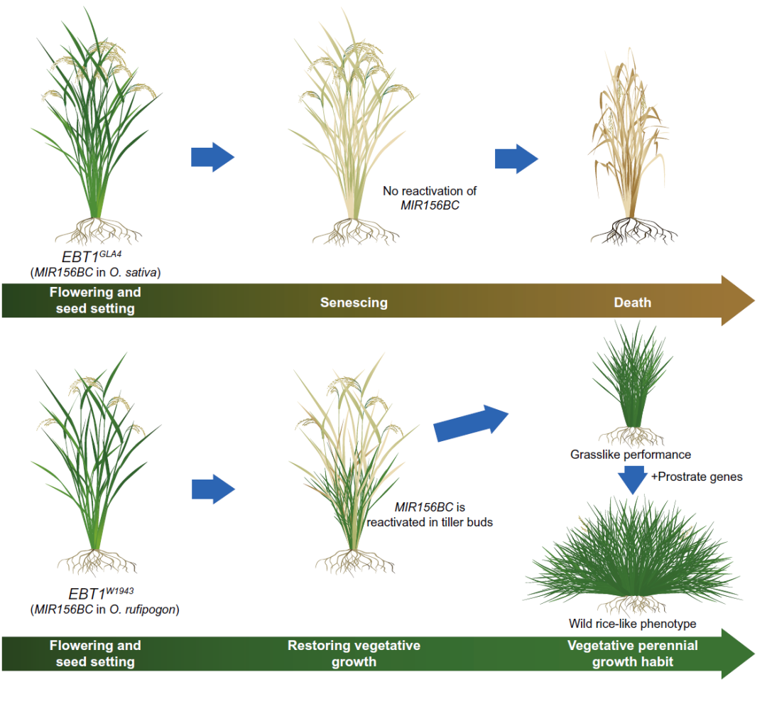 栽培水稻具有有限的生命周期,从开花结种到衰老,MIR156BC未被重新激活。在携带野生稻MIR156BC等位基因的栽培水稻中,MIR156BC在种子成熟后的节间分蘖芽中被重新激活,从而支持持续生长,并表现出类似禾草的性状,包括花序逆转和营养繁殖能力。进一步聚合匍匐生长基因后,植株转变为类似野生的形态,支持营养多年生生长。
