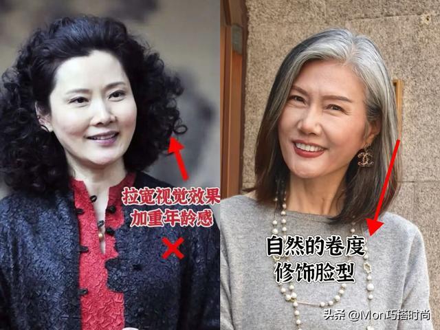此外,头发的蓬松感也是很重要的,特别是年纪大的女人,脸型发腮变圆润了,头发也开始有脱发的问题,如果头发直直地贴着我们的头皮,既显得油腻,也会显得脸大;而有蓬松感的发型则可以跟我们的脸型有所对比,衬的脸型流畅一点,减少面部的留白度。